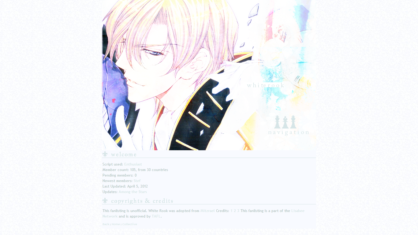 White Rook was designed in Paint Shop Pro 7 and coded in Notepad. The fonts used are Trebuchet MS and Adobe Caslon Pro. Times New Roman is used where Caslon is not supported. Individual credits can be found here.